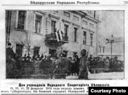 24. 19 лютага 1918 года. Упершыню беларускі сьцяг узьняўся над будынкам губэрнатарскага палаца ў Менску пасьля выгнаньня бальшавікоў [24*].