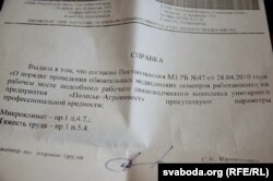 Яна зьдзіўляецца, што на былой працы яе падманулі. Запэўнівалі, што жанчына ня пройдзе мэдыцынскую камісію. Але на мінулым тыдні Тацяна зьвярнулася да мэдыкаў у Петрыкаве, і там сказалі, што прынамсі падсобнай рабочай на сьвінакомплексе яна можа працаваць. Далі адпаведныя паперы. Дазволіла такую працу і мэдыка-рэабілітацыйная камісія.