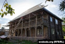 Цяпер рабочыя перакрываюць дах. Старую дахоўку зьнялі раней, а замест яе кладуць сьвежыя драўляныя гонты — пласьціны 70×12 сантымэтраў. З фасаднай часткі дах ужо пераклалі.