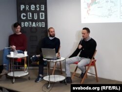 Мікалай Анішчанка, Кшыштаф Мрозэк (Фонд імя Стэфана Баторыя) і Андрэй Елісееў на круглым стале ў Менску. Кастрычнік 2018.
