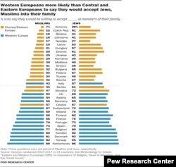 Як адзначаюць дасьледнікі Pew, амаль ва ўсіх краінах Цэнтральнай і Ўсходняй Эўропы менш за палову апытаных заявілі, што яны былі б гатовы прыняць мусульман у свае сем'і, пры гэтым амаль ва ўсіх заходнеэўрапейскіх краінах, дзе праводзілася апытаньне, больш за палову апытаных паведамілі пра гатоўнасьць прыняць мусульман у сваю сямʼю.
