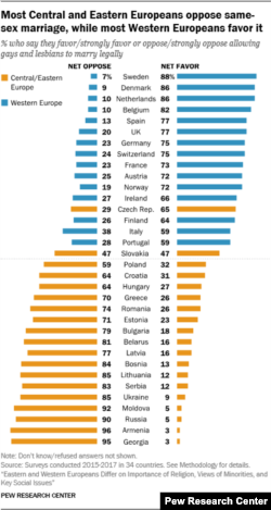 Паміж жыхарамі постсавецкіх краінаў і Усходняй Эўропы, і жыхарамі краінаў Заходняй Эўропы, назіраецца выразны водападзел, разрыў у стаўленьні да гэтых пытаньняў.