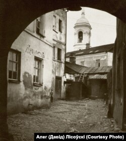 Падворку, які на старым фатаздымку, ужо няма. Ён зьнік разам са званіцай Спаскай царквы, што на дальнім пляне. Зь яго глыбіні за фатографам сочыць падлетак. Ён не наважваецца выйсьці са сваёй схованкі. Назірае з-за кута...