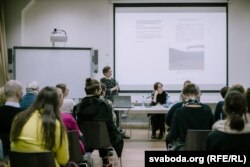 Вольга Шпарага падчас прэзэнтацыі кнігі «Супольнасьць-пасьля-Галакосту»