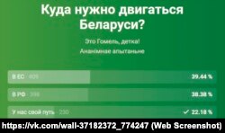 У групе «Это Гомель, детка», дзе 111 тысяч падпісчыкаў, запыталіся: «Куды трэба рухацца Беларусі?». 39% прагаласавалі за Эўразьвяз, 38% — за Расею, і 22% — за «свой шлях».