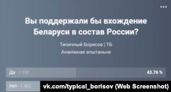 Самы буйны адсотак за далучэньне да Расеі карэспандэнт Свабоды заўважыў у пабліку «Твой Барысаў». Тут галасавалі 2,6 тысячы чалавек, зь іх 43% адказалі «так», 56% — «не».