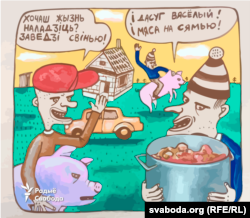 «Хочаш жызьнь наладзіць — завядзі сям’ю, — перакананыя Саша і Сірожа, жыцьцярадасныя пэрсанажы мастака Аляксея Хацкевіча. — І дасуг вясёлы, і мяса на сям’ю!»