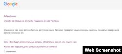У службе падтрымкі Google Свабодзе адказалі, што сэрвісы Google Ads (рэклямная плятформа Google) проста «не падтрымліваюць беларускую мову».