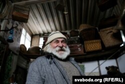Мы заходзім у першае з памяшканьняў. Унутры ўсё застаўлена вельмі шчыльна. На паліцы пад стольлю шмат плеценых рэчаў.