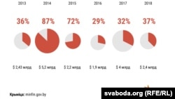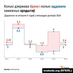 9,7 мільярда даляраў Беларусь пазычыла ў Расеі за шэсьць гадоў (2012–2018). Зь іх Расеі аддалі менш за палову — 4,2 мільярда. Гэта грошы, якія Беларусі пазычыў урад Расеі і дзяржаўныя банкі агулам.