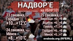 Наведнікам сталічнага канцэрту, які заплянавалі ў Кіеўскім сквэры, пашанцуе меней, калі верыць Белгідрамэту. Ад раніцы магчымы дождж і +4...+6, удзень магчымы дождж і +8...+10, вецер у 7–9 м/с з парывамі да 15 м/с. Пад вечар прагназуюць, што ападкі скончацца.