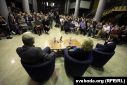 Новы сэзон паседжаньняў «Інтэлектуальнага клюбу» нобэлеўскай ляўрэаткі Сьвятланы Алексіевіч аднавіўся 26 сакавіка ў Літоўскай амбасадзе ў Менску. Першыя госьці клюбу — папулярныя беларускія пісьменьнікі Альгерд Бахарэвіч і Віктар Марціновіч. Мадэратарка імпрэзы — журналістка Сьвятлана Калінкіна. Свабода вяла жывую трансьляцыю і сабрала самыя цікавыя цытаты з інтэлектуальнага двубою.