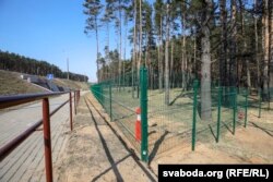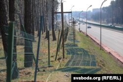 Побач з выкапанымі ямамі ўжо ляжаць зялёныя слупкі і панэлі сеткі. Будоўлю па-ранейшаму кантралююць міліцыянты ў форме і супрацоўнікі у цывільным.