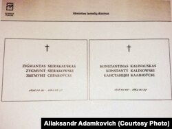 «На гэтым месцы пахаваныя ўдзельнікі паўстаньня 1863–64 гадоў і яго кіраўнікі Зыгмунт Серакоўскі і Кастусь Каліноўскі».