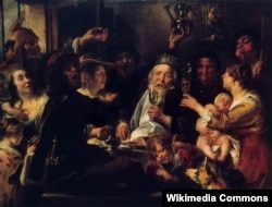 „Я піў і амаль не п’янеў“ — кажа герой Караткевіча. Добра закусваў, канешне. Як закусваў — было тут. А цяпер — як хвацка выпіваў. Ілюстрацыя: Якаб Ёрданс «Бабовы кароль» (1638).