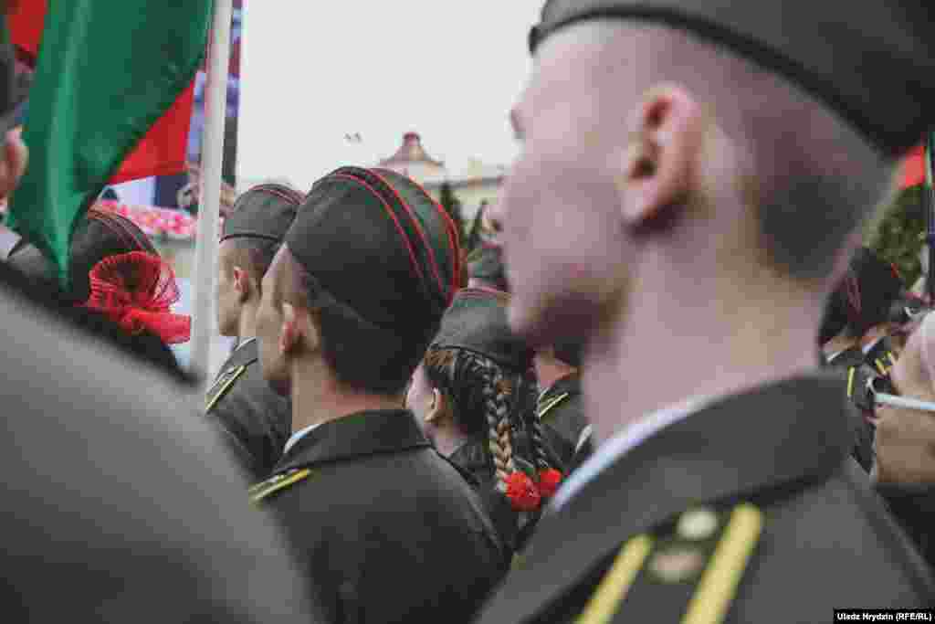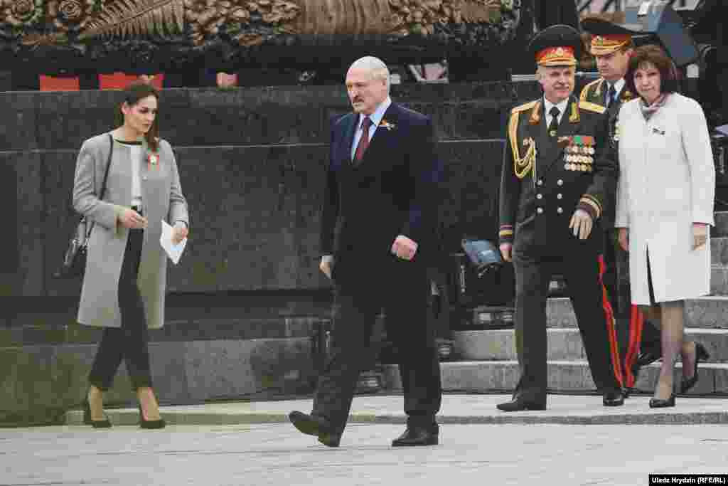 Побач з Аляксандрам Лукашэнкам на цырымоніі, як і ў мінулыя гады, былі сыны Віктар (першы зьлева), Дзьмітрый (другі зьлева) і Мікалай (трэці зьлева), а таксама шэраг чыноўнікаў: зьлева ад Лукашэнкі старшыня Савету рэспублікі Міхаіл Мясьніковіч, справа — прэм’ер-міністар Сяргей Румас