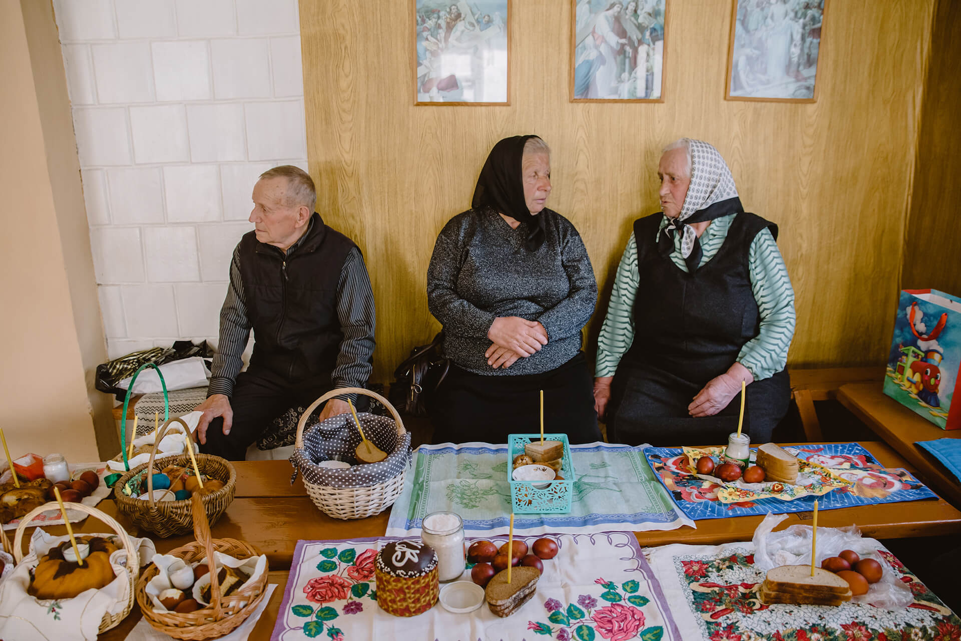 Да 17-й гадзіны пачынаюць падцягвацца праваслаўныя. Яны прыйшлі асьвяціць ежу перад Вялікаднем. Служба ў іх даўжэйшая. Хто сыходзіць апошнім, заносіць ключы каталічцы Валянціне, бо тая жыве бліжэй за ўсіх да капліцы.