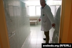 Тым часам галоўны лекар дэманструе, што на паверх вышэй ёсьць прыбіральні з шырокім праходам — у аддзяленьні рэабілітацыі.