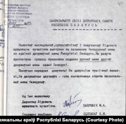 — Закону аб мовах, прынятым у 1990-м годзе, папярэднічала народнае абмеркаваньне. У Вярхоўны Савет БССР, які пазьней стаў парлямэнтам незалежнай Беларусі, накіроўваліся дзясяткі тысяч рэакцыі ў падтрымку беларускай мовы ад шараговых грамадзянаў, ад працоўных калектываў, ад настаўнікаў... Уражвае, што рэагавалі абсалютна ўсе сацыяльныя слаі насельніцтва. Вайскоўцы, студэнткі, хатнія гаспадыні пісалі лісты і слалі тэлеграмы з абгрунтаваньнем, чаму нам патрэбная беларуская мова як адзіная дзяржаўная. Гэта было вельмі інтэнсіўнае прыняцьце беларускай мовы Прыкладна палова лістоў у падтрымку беларускай мовы, як адзінай дзяржаўнай, была напісаная па-расейску, палова — па-беларуску.