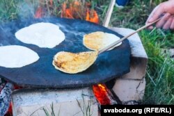 Здабыты агонь нясуць да кухні, дзе сымбалічна запальваецца вогнішча, на якім падчас усяго фэстывалю гаспадыні выпякаюць мучныя праснакі зь мёдам, сочывам і зелянінай, запарваюць гарбату на зёлках.