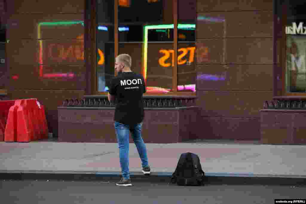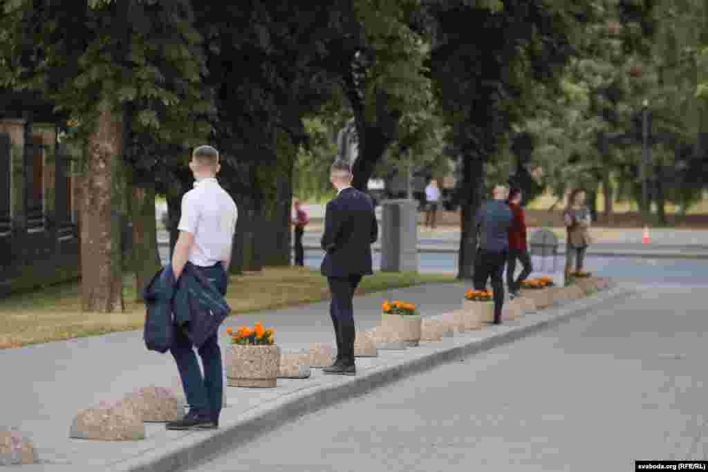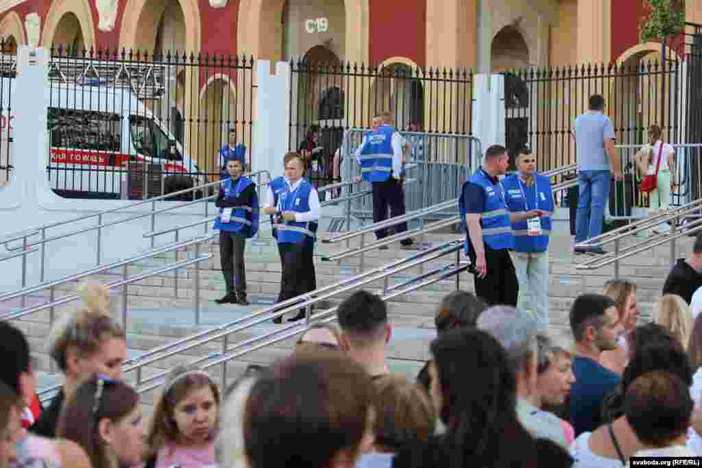 Праз галоўны ўваход амаль нікога не пускалі. Ён быў аддадзены VIP-пэрсонам. На фота другі справа – міністар унутраных спраў Юры Караеў, у цэнтры з рацыяй – начальнік Галоўнага ўпраўленьня ўнутраных спраў Менгарвыканкаму Іван Кубракоў, зьлева ў профіль з вусамі – сын і памочнік прэзыдэнта па нацыянальнай бясьпецы Віктар Лукашэнка.