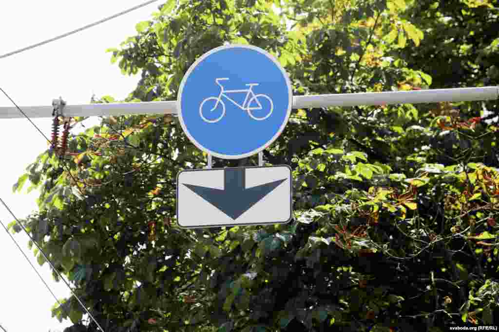 Разьметка на дарозе зробленая жоўтай фарбай. Каля дарогі паставілі знакі, якія пазначаюць, што паласа каля краю прызначана толькі для руху раварыстаў