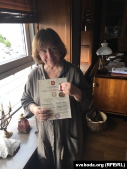 Пісьменьніца сказала, што вельмі цэніць гэтую ўзнагароду, і выказала падзяку старшыні Рады БНР Івонцы Сурвіле, якая падпісала дэкрэт аб узнагароджаньні.