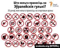 Сэлфі-палкі, ежу, спортінвэнтар, незарэгістраваную сымболіку, катоў, сабак, самакаты, цыгарэты, дзіцячыя калыскі — далёка няпоўны сьпіс усяго таго, што нельга было праносіць падчас Эўрагульняў на спартовыя арэны.