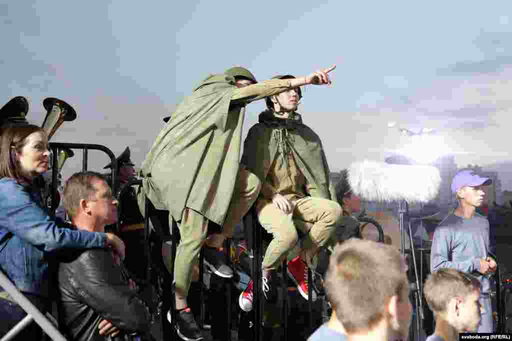 Удзельнікі тэатралізаванай часткі назіраюць за парадам