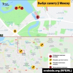 - Ад месца запуску салютаў у парку Перамогі да месца, дзе была сьмяротна параненая жанчына, было больш за 500 мэтраў. Шыбы ў дамах на вуліцы Чарвякова аскепкі разьбілі на адлегласьці больш як кілямэтар.