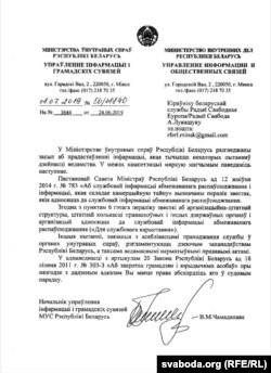У адказе Радыё Свабода начальнік упраўленьня інфармацыі і грамадзкіх сувязяў МУС Беларусі Вольга Чамаданава спасылаецца на пастанову Саўміну №783 «Аб службовай інфармацыі абмежаванага распаўсюджваньня і інфармацыі, якая складае камэрцыйную тайну».