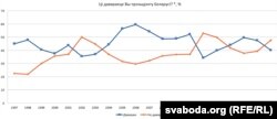 * Крыніца: сайт інстытуту, на графіку пададзеныя сярэднія паказьнікі па ўсіх апытаньнях за адпаведныя гады