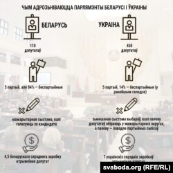 З выбарамі ў беларускую Палату прадстаўнікоў усё проста — кожны дэпутат балятуецца па сваёй акрузе і перамагае большасьцю набраных галасоў, так званая мажарытарная сыстэма. Ва Ўкраіне складаней — палова з 450 дэпутатаў (225 чалавек) выбіраецца, як і ў Беларусі, паводле мажарытарнай сыстэмы. Праз канфлікт на ўсходзе Ўкраіны сёлета колькасьць выбраных прамым галасаваньнем дэпутатаў скарацілася да 199 акруг. Яшчэ 225 дэпутатаў Вярхоўнай Рады выбіраюцца паводле партыйных сьпісаў. Гэта значыць, што грамадзяне галасуюць за кожную асобную партыю, а ўжо яе кіраўніцтва вырашае, каго накіраваць у склад Вярхоўнай Рады ў якасьці дэпутата. У парлямэнт праходзяць усе партыі, якія на выбарах набралі больш за 5% галасоў.