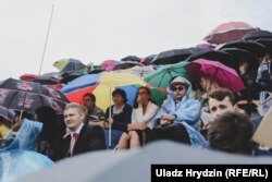 Стадыён «Трактар» адкрыты, тут лёгка можна трапіць пад дождж. Але калі той пачынаецца, людзі не сыходзяць, раскрываюць парасоны.