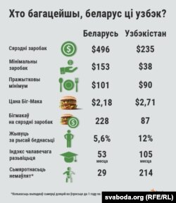 Узбэкістан — адносна небагатая краіна, істотна бяднейшая, чым Беларусь. Пра гэта сьведчаць дадзеныя эканамічнай і сацыяльнай статыстыкі.