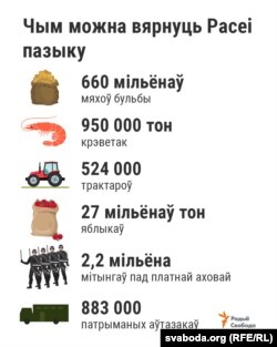 На сустрэчу з Уладзімірам Пуціным у сьнежні мінулага году Аляксандар Лукашэнка прывёз бульбу са свайго агароду. У кадар тады трапілі адразу чатыры вялікія мяхі. Каб вярнуць 7,6 мільярда, трэба 660 мільёнаў такіх мяхоў — калі лічыць па сярэднім кошце на рынку.
