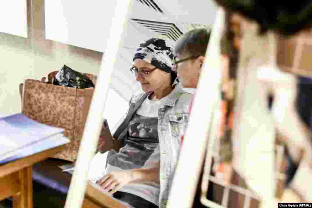 Арганізатарка Ірына Жыхар прымярае парык, які яна насіла падчас хваробы
