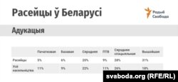 Сярод расейцаў больш высокая доля асобаў з вышэйшай адукацыяй і меншая — зь нізкай, асобаў з пачатковай і з базавай адукацыяй сярод іх прыкладна ўдвая менш, чым сярод усяго насельніцтва. У астатніх адукацыйных катэгорыях адрозьненьні нязначныя.