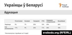 Сярод украінцаў была прыкметна большая, чым сярод усяго насельніцтва, доля асобаў з вышэйшай адукацыяй і прыкладна ўдвая менш людзей зь нізкай адукацыяй — пачатковай і базавай.
