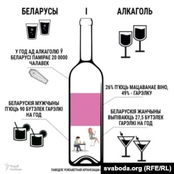 На аднаго беларускага мужчыну ў сярэднім прыпадае 18 літраў чыстага сьпірту — гэта 90 паўлітровых пляшак гарэлкі на год. Жанчыны ў Беларусі спажываюць 5,5 літра сьпірту — гэта 27,5 бутэлькі гарэлкі на год.