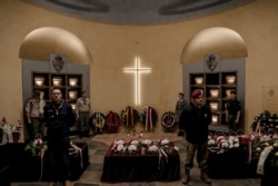 Дзьве першыя труны накрытыя чырвоным штандарам з паўстанцкім гербам — літоўскай «Пагоняй», польскім арлом і нябесным заступнікам арханёлам Міхаілам. У іх тое, што засталося ад камандзіраў — Кастуся Каліноўскага і Зыгмунта Серакоўскага.