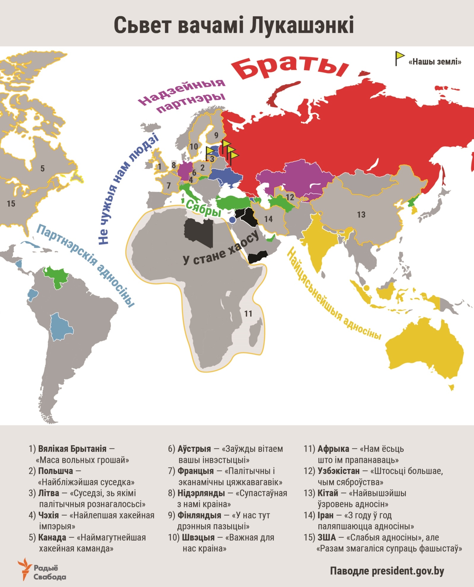 Свабода паглядзела, што Аляксандар Лукашэнка казаў пра розныя краіны і рэгіёны сьвету і склала мапу паводле ягоных выказваньняў.