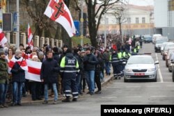 - А 14-й гадзіне пратэстоўцы перайшлі з Кастрычніцкай плошчы да плошчы Незалежнасьці. Там прагучалі кароткая прамова і малітва. Міліцыя не замінала шэсьцю, пакуль людзі ішлі праспэктам Незалежнасьці.
