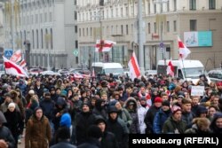 14:25 Калёна расьцягнулася на некалькі сотняў мэтраў уздоўж вуліц Валадарскага і Рэвалюцыйнай. На заклік Паўла Севярынца людзі ідуць да плошчы Свабоды. Там мае адбыцца наступны прыпынак шэсьця — пратэсту супраць паглыбленьня інтэграцыі з Расеяй.