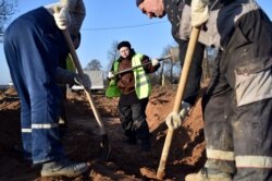 Ён і ягоныя людзі абазначаныя сьвятлоадбівальнымі накідкамі з надпісам «археоляг». Тут жа мужчыны ў спэцоўках: гэта не прафэсіяналы, яны дапамагаюць расчышчаць адвалы ды заглыбляцца ў магілы — гэтымі кадрамі забясьпечылі раённыя ўлады.