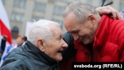 89-гадовы ўдзельнік акцыі Ўладзімер Мазанік разам з паэтам, экс-кандыдатам на прэзыдэнта Ўладзімерам Някляевым.
