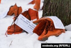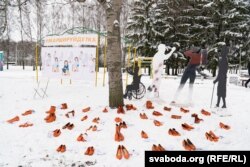 Актывісткі паўтарылі нашумелую акцыю: на белым сьнезе выставілі пафарбаваныя аранжавым туфлі. Кожная пара рэпрэзэнтуе чалавека, які загінуў ад хатняга гвалту. На пікеце тэму туфляў раскрылі крыху больш: актывісткі зачытвалі рэальныя гісторыі памерлых ахвяраў.