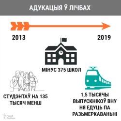 Цяпер у Беларусі працуе 3020 школ, 7 гадоў таму іх было 3395 — значыць, іх колькасьць скарацілася на 375. Пры гэтым вучняў стала больш. Па зьвестках Белстату за 2019 год, цяпер іх 1 мільён 31 тысяча, а ў 2013 годзе была 931 тысяча. Гэта значыць, што напаўняльнасьць клясаў цяпер большая, чым 7 гадоў таму.