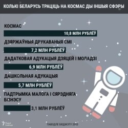 Беларуская дзяржаўная праграма «выкарыстаньне касьмічнай прасторы ў мірных мэтах» абыходзіцца бюджэту на гэты год у 10,8 мільёна рублёў. На дашкольную адукацыю закладзена амаль удвая меней, 5,7 мільёна, а гэта фінансаваньне ўсіх дзіцячых садкоў. Менш трацяць (7,2 мільёна) на ўсе друкаваныя дзяржаўныя сродкі інфармацыі. Праграма разьвіцьця ўсяго малога і сярэдняга прадпрымальніцтва ў Беларусі на гэты год каштуе бюджэту ўтрая таньней, чым засваеньне космасу. Дзяржаўная праграма «Абарона інфармацыі» таньнейшая за засваеньне космасу ў 14 разоў. На дадатковую адукацыю дзяцей і моладзі дзяржава траціць на 3,8 мільёна рублёў менш, чым на космас.