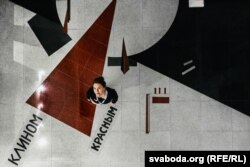 На падлозе фае віцебскага музэю — выява агітацыйнага пляката «Клінам чырвоным бей белых», створанага Лісіцкім у 1920 годзе. На адным з фатаздымкаў, выкладзеных на старонцы музэю ў «Фэйсбуку», Валерыя ўбачыла маладых у шлюбным адзеньні, якія ляжалі проста на падлозе.